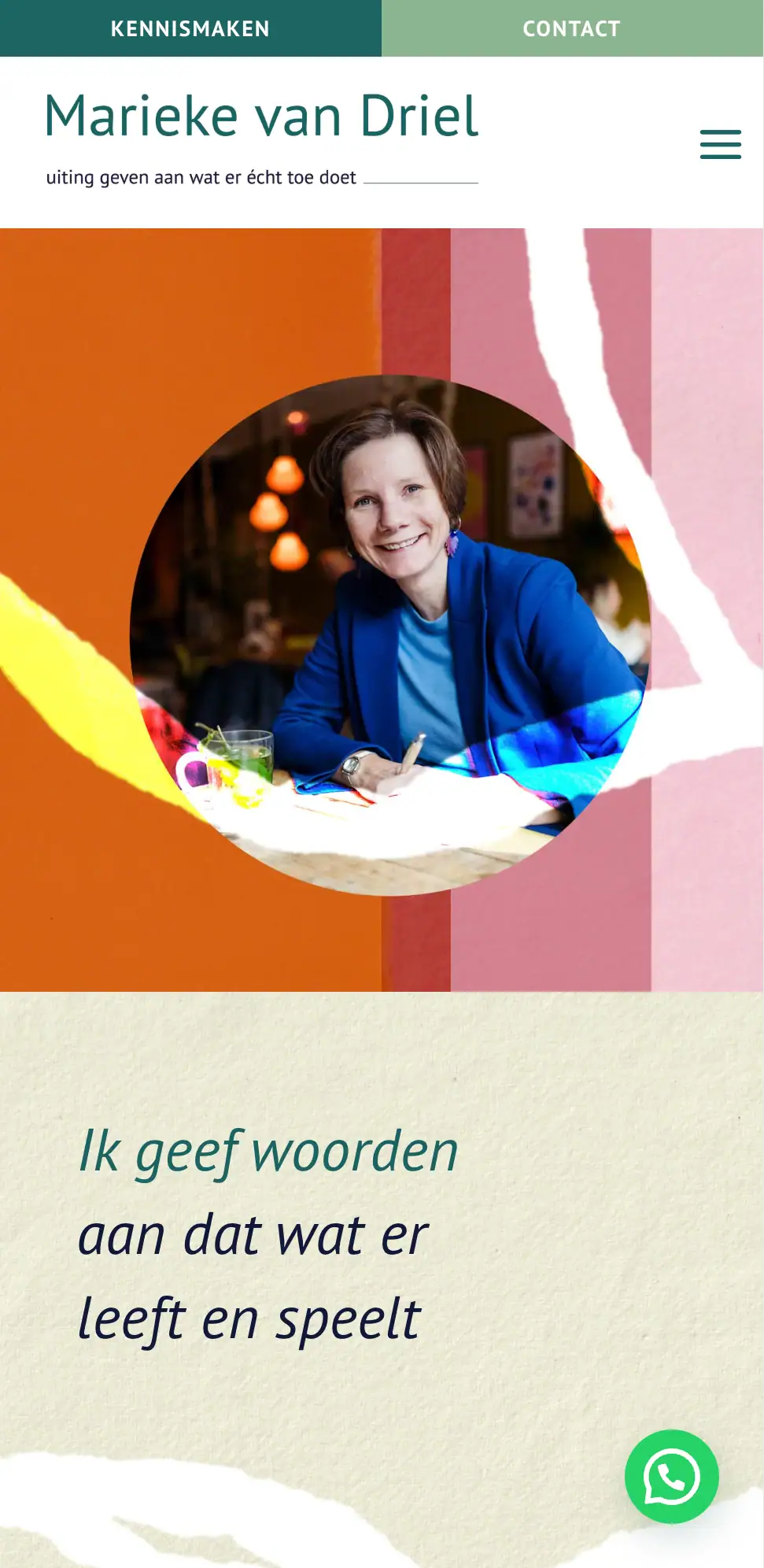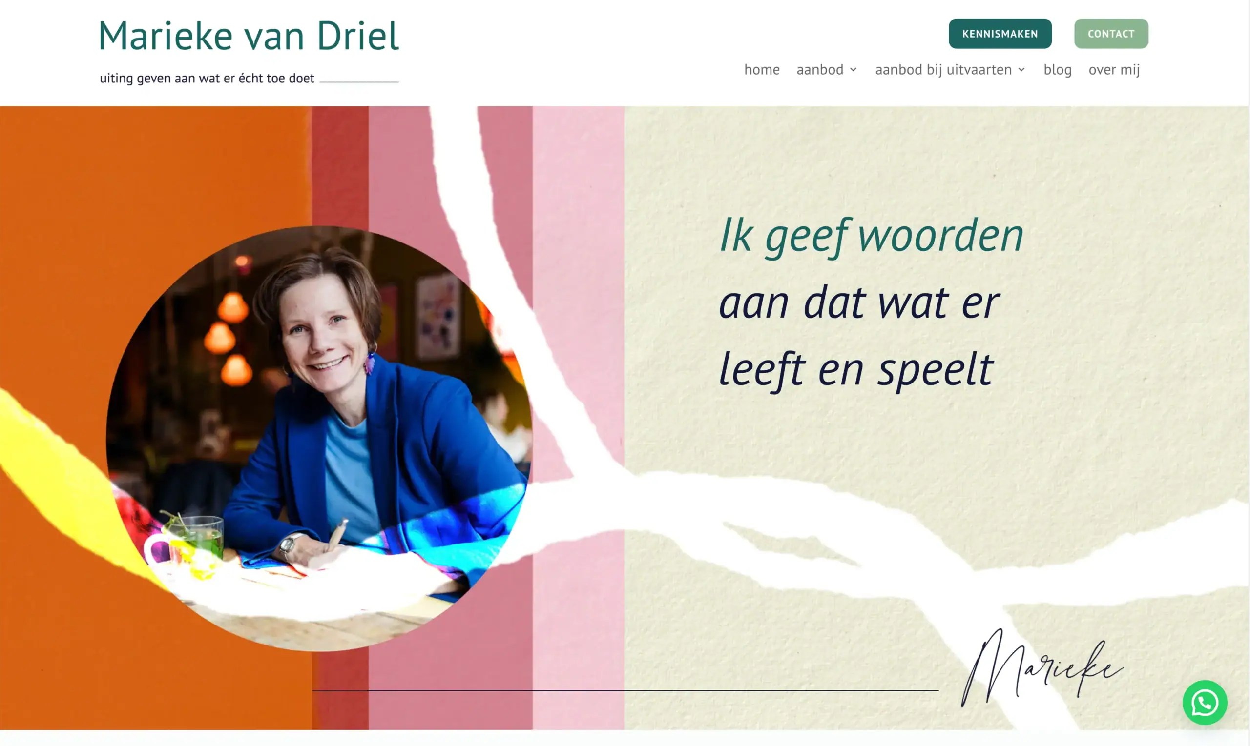 De illustraties in de headers bijvoorbeeld: ze breken op in vierkante blokken onder elkaar als je de website op mobiel bekijkt, zodat de quotes die te zien zijn ook leesbaar blijven. Als er nieuwe onderdelen op de website nodig zijn, vormt de huisstijl een goeie basis om op voort te borduren. Bekijk de website van Marieke van Driel om te zien hoe alle vakgebieden samenkomen.